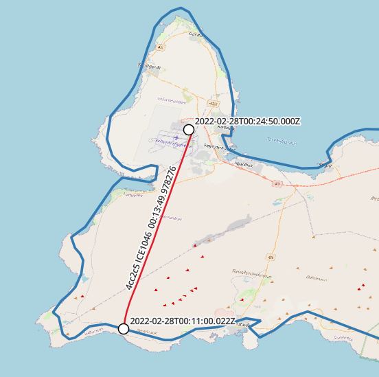 select icao24, callsign, trajectory(atPeriod(T.Trip, '[2022-02-28 00:00:00+00, [2022-2-28 03:00:00+00]'::period)) FROM flightsegments T, ne_10m_admin_0_countries R WHERE T.Trip && stbox(R.geom, '[2022-02-28 00:00:00+00, [2022-02-28 03:00:00+00]'::period) AND st_intersects(trajectory(atPeriod(T.Trip, '[2022-02-28 00:00:00+00, [2022-2-28 03:00:00+00]'::period)), r.geom) and R.name = 'Iceland' and st_length(trajectory(atPeriod(T.Trip, '[2022-02-28 00:00:00+00, [2022-2-28 03:00:00+00]'::period))::geography) > 0 |