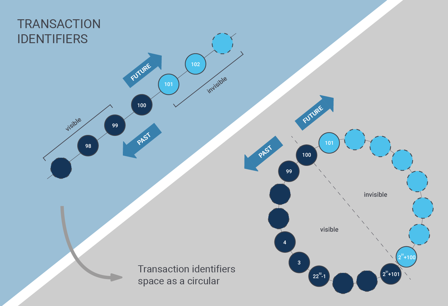 Internally, this kind of visibility management is mostly done by comparing transaction IDs. Every version of every row gets tagged with the transaction ID that wrote it and every reading transaction takes note of which transactions it can see by taking a snapshot (if you are interested in how this works, check out tqual.c in the PostgreSQL source code). There is just one problem: Transaction IDs are finite, 4 billion in total. At some point they will wrap around, with preceding 2 billion values considered to be the past and the next 2 billion to be the future. What was once past becomes the future and the database will return incorrect results. PostgreSQL will stop accepting new transactions if this could happen and autovacuum will kick in to prevent things from getting to that point.