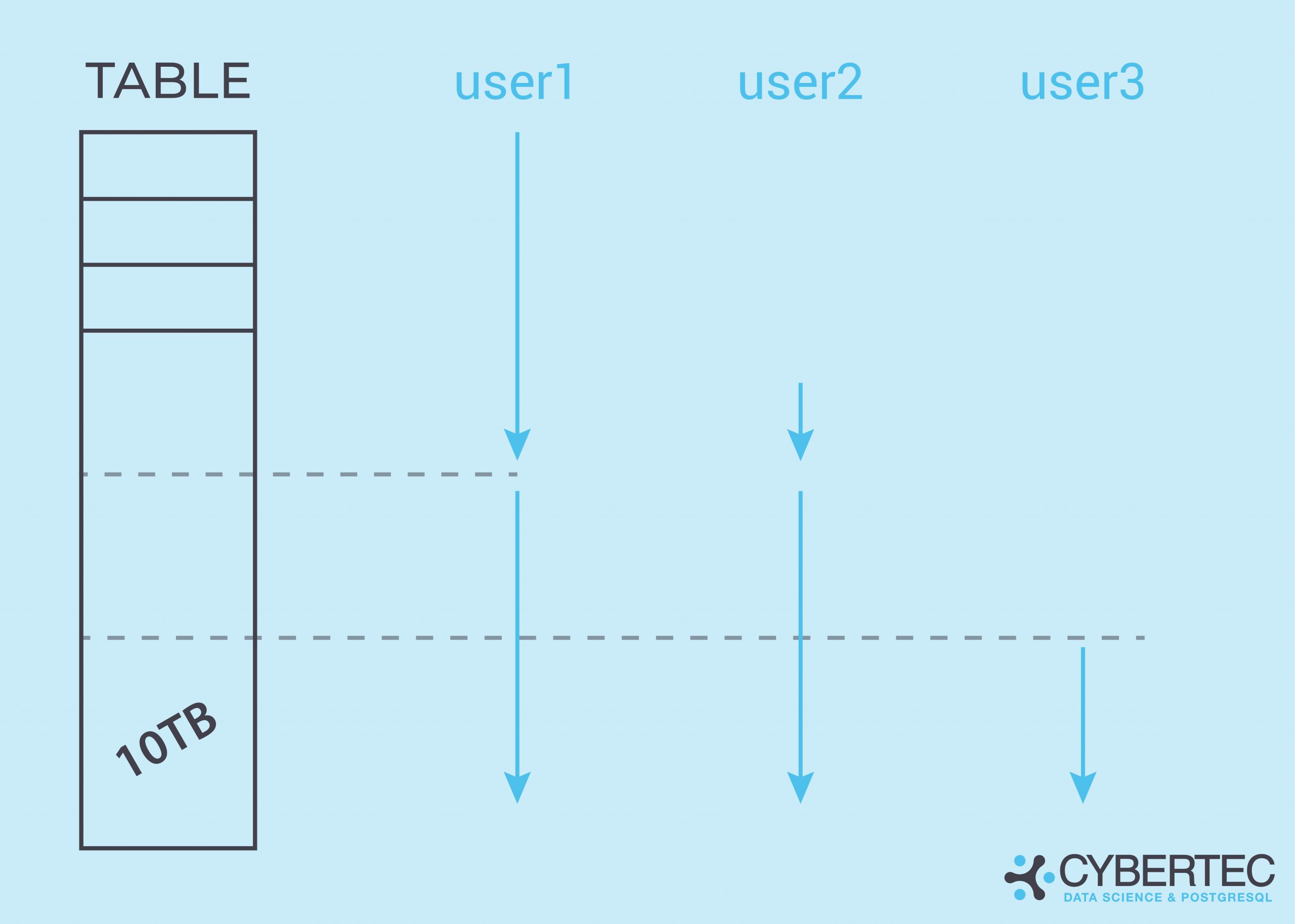 More users can be added as needed. By keeping the scans together, I/O can be reduced dramatically in many cases - especially if the amount of data is really large. What is important to note here is that PostgreSQL synchronizes the scans once, but does not force them to stay together. If one of the scans is significantly slower than the other one, the scans won’t stick together, but will go separate ways, to make sure that neither scan is forced to execute slowly.