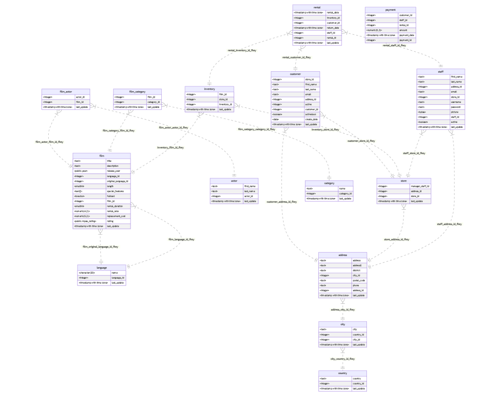Today I will show you how to generate an ER diagram for any PostgreSQL database using only plain SQL and Mermaid. I propose to use the Pagila example database as a target. You may either install it locally, or run a Docker Compos script.