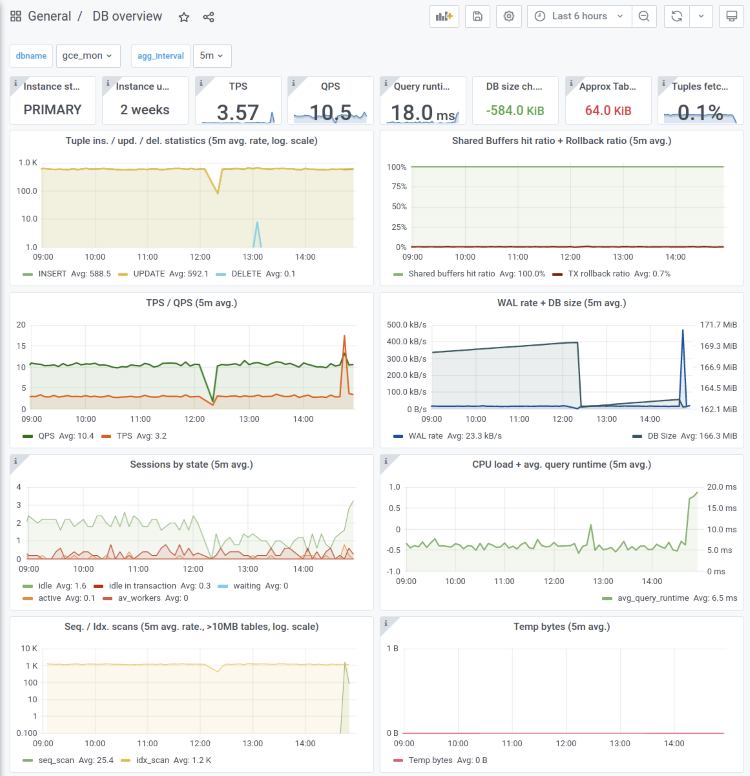 Also, instead of the standard “DB overview” dashboard that most often serves as a starting point when reports of weird database behavior come in, you might prefer using the “DB overview unprivileged” dashboard. It's compiled exactly for such cases where the metrics agent might not have full access. In this case, we only show metrics that are always there, even for plain users with only a CONNECT