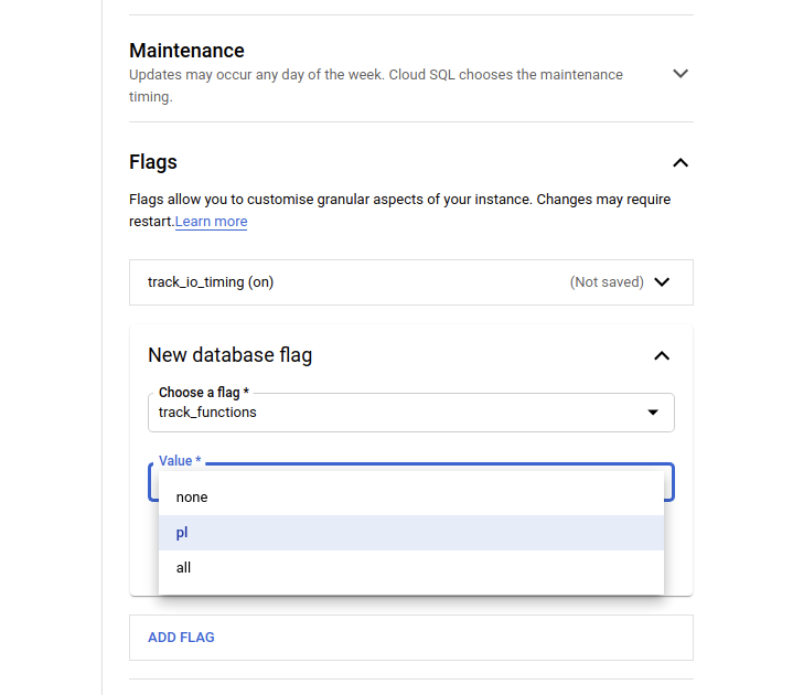 setting is normally not needed unless you plan to optimize some C functions coming in from extensions. For the Google service, this would look something like what you see below. Remember, server configuration parameters/settings are called “flags” on Google Cloud!