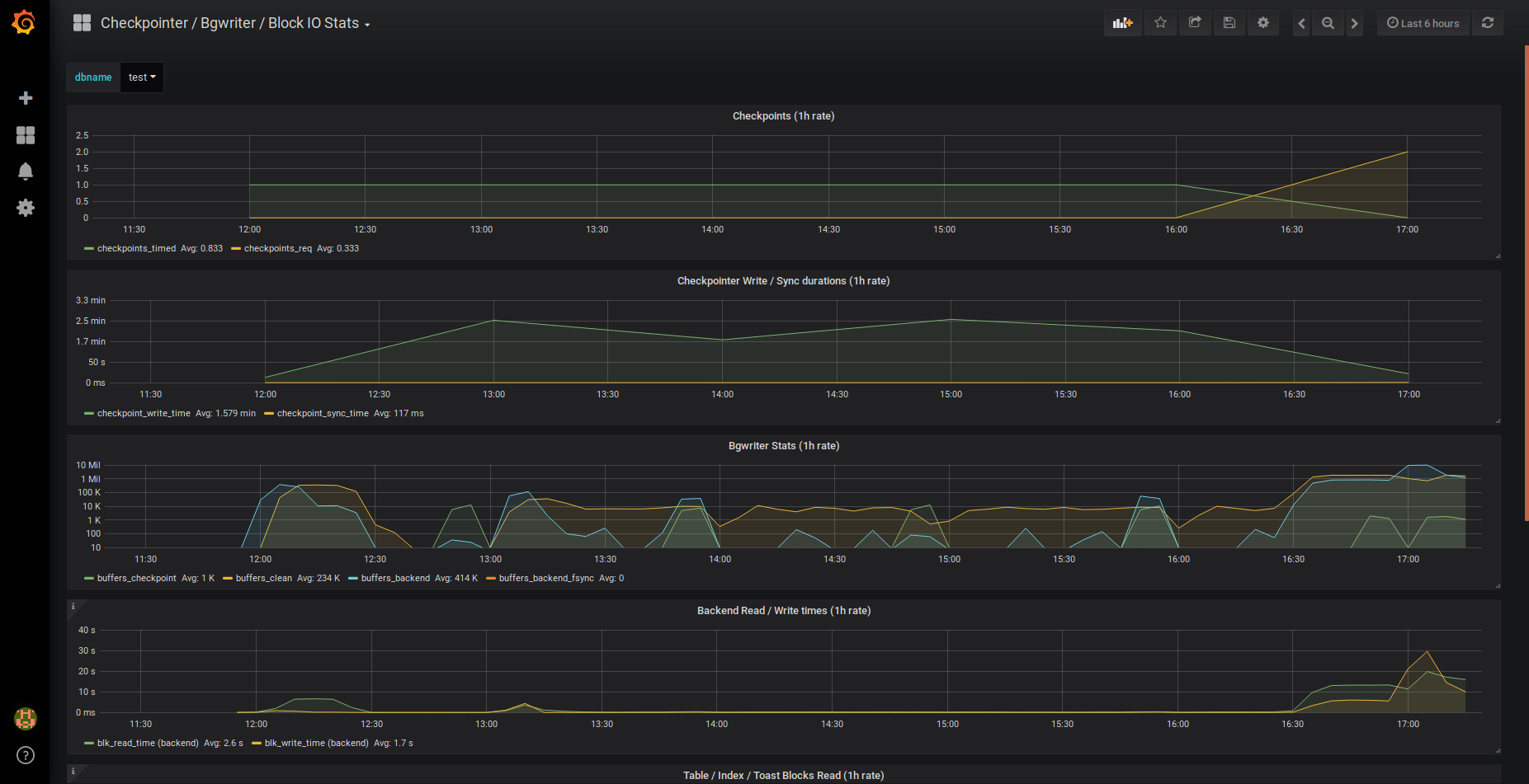 To visualize checkpoint frequencies, background writer and block IO based on Postgres internal metrics.