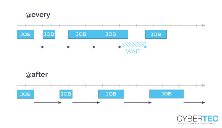 The only difference is that @every task will be repeated within at equal intervals of time. In contrast, @after task will repeat itself in an interval only after the previous job was finished. See the figure below for details.