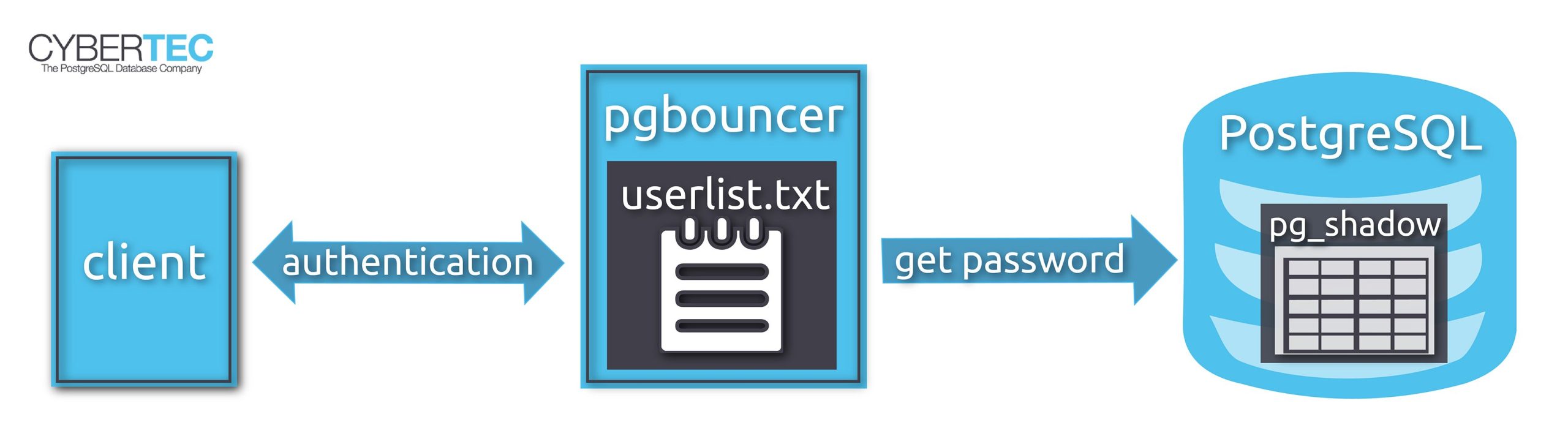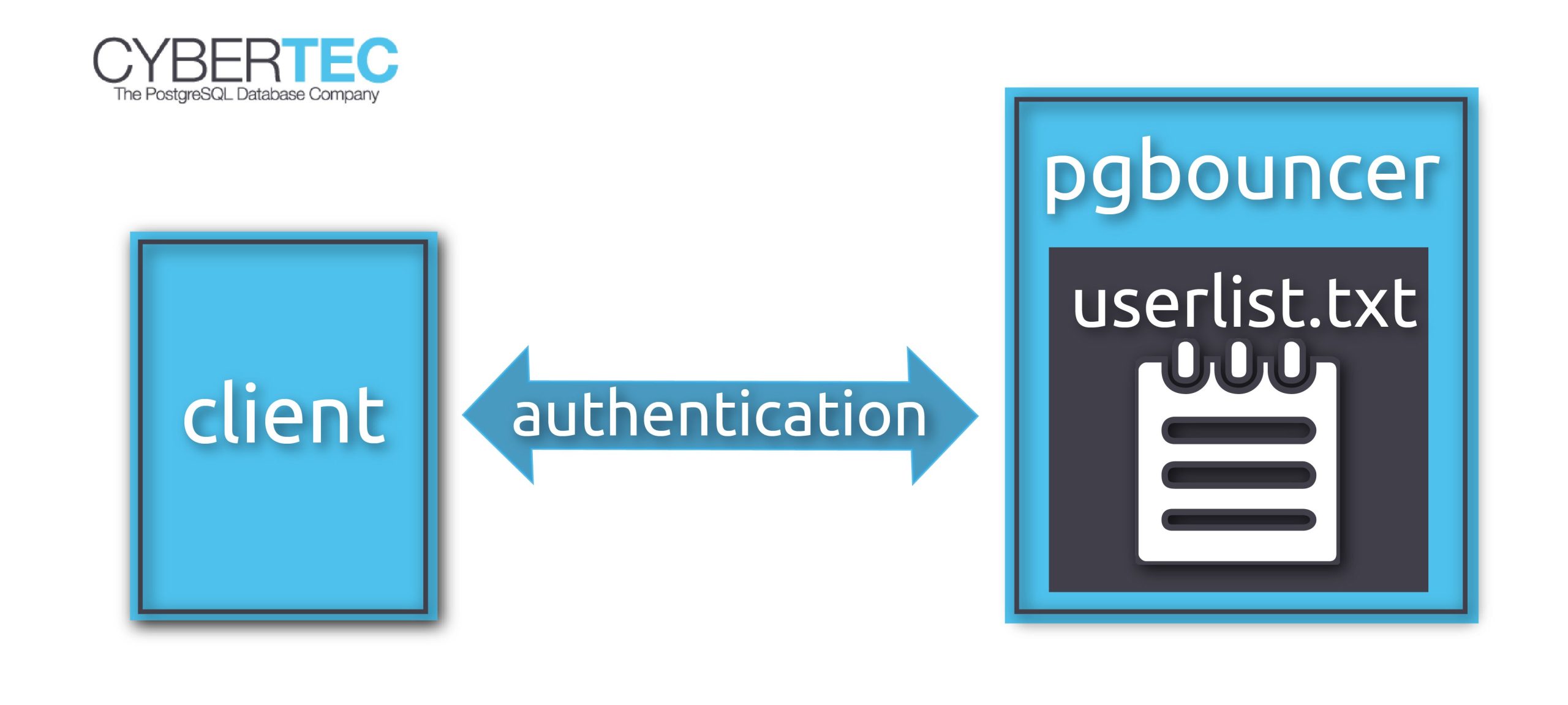 Since clients connect to pgbouncer, it will have to be able to authenticate them, so we have to configure it accordingly.