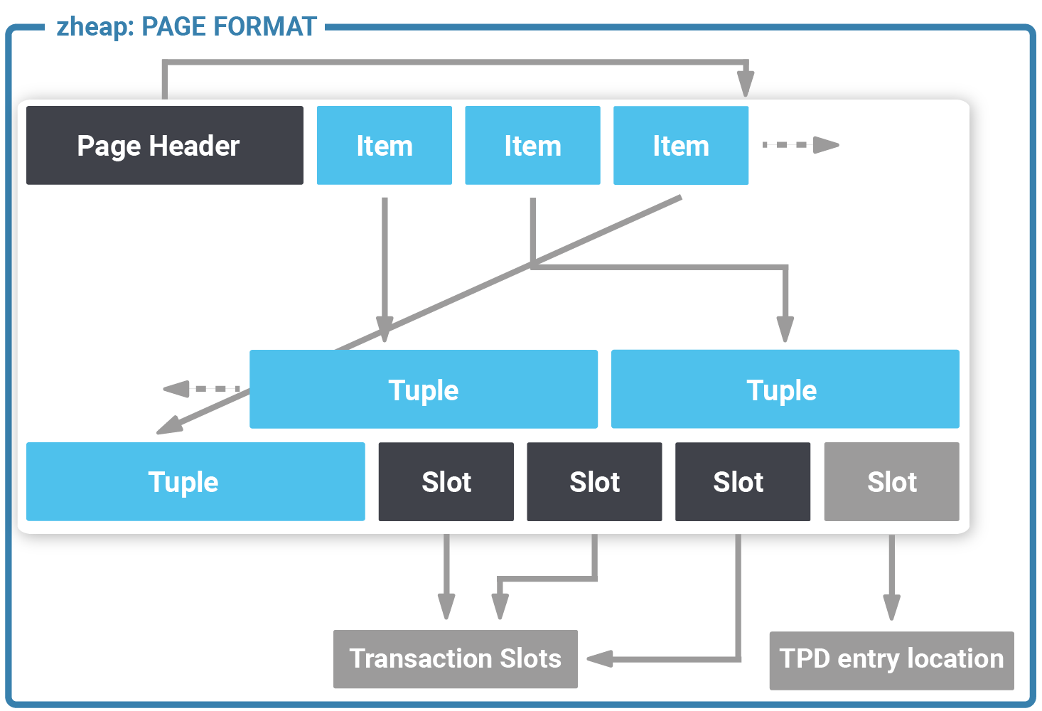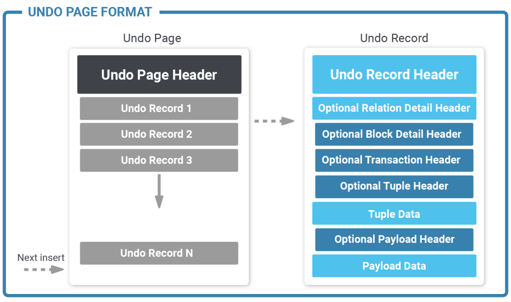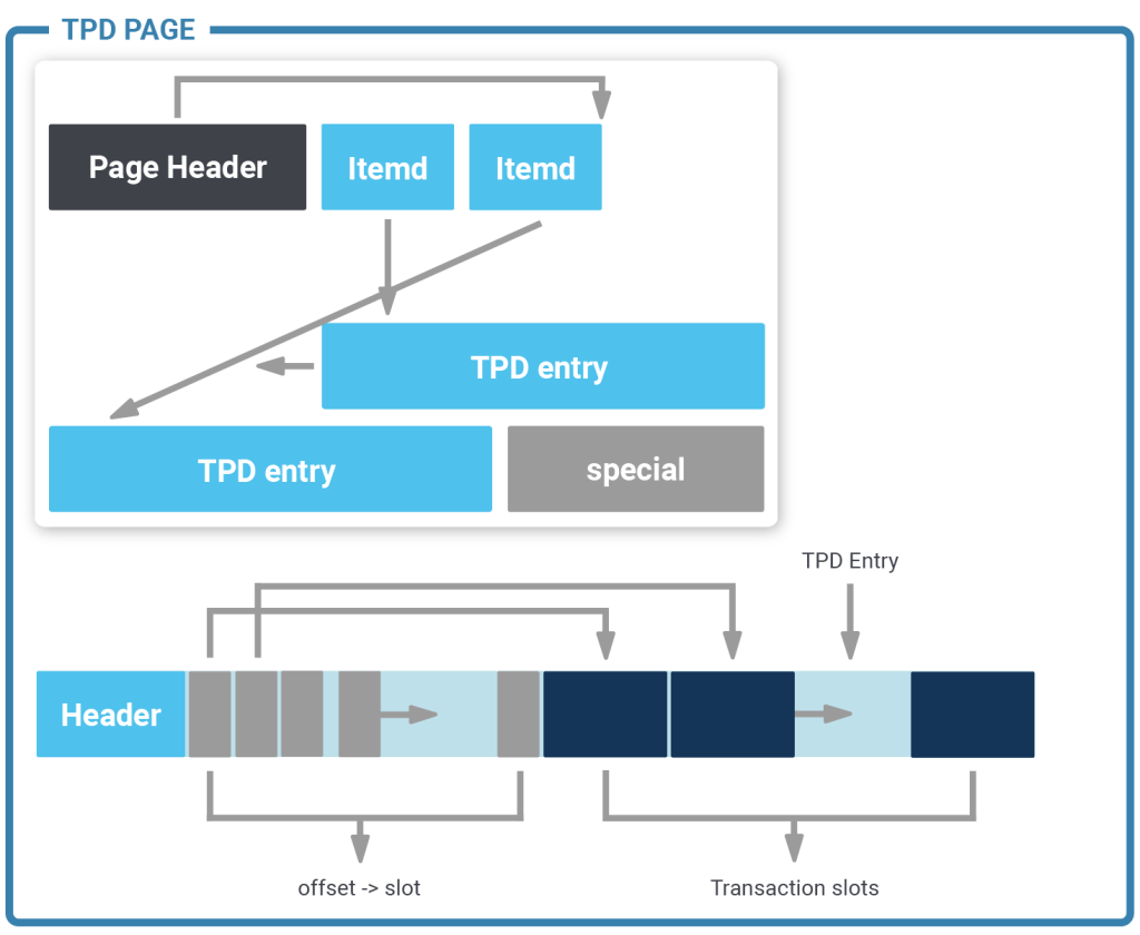 A transaction occupies 16 bytes of storage and contains the following information: transaction id, epoch and the latest undo record pointer of that transaction. A row points to a transaction slot. The default number of transaction slots in the table is 4 which is usually ok for big tables. However, sometimes more transaction slots are needed. In this case, zheap has something called “TPD” which is nothing more than an overflow area to store additional transaction information as needed.